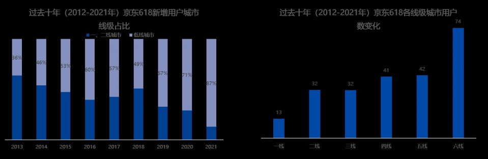 过去十年,下沉市场已经成为京东618新增用户的绝对主力。京东大数据显示, 2012-2021年京东618新增用户来自下沉市场的占比逐年提升,到2021年占比已经近9成。其中,六线城市参与京东618的用户增长最快,过去十年增长了74倍。