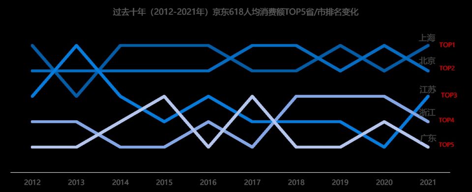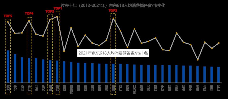 过去十年,消费大省/市强者恒强。京东大数据显示,对比十年(2012-2021年)前后,京东618人均消费额TOP5省/市的排名保持不变,依次为上海、北京、江苏、浙江和广东。