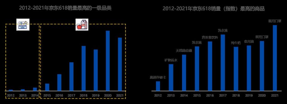 过去十年,哪些商品最受青睐?从低频的电脑到高频的食品饮料,那些年我们最爱的商品有着鲜明的时代印记。从品类销量来看,京东大数据显示2012-2014年是电脑办公的时代,2015-2021年是吃吃喝喝的时代,食品饮料的销量最高。单品的销量数据呈现了从低频到高频的消费趋势,从高速储存卡和无线路由器,到纯牛奶和洗衣液,再到受新冠疫情影响下的医用口罩。