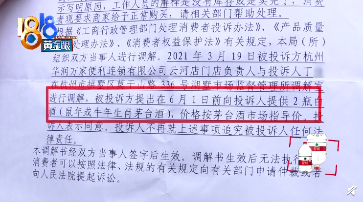 商业 华润万家卖茅台加价:监管部门调解书后“又涨价了” 2021-06-20 09:57:38 分享 来源:1818黄金眼丁先生反映,3个月前,自己到杭州华润万家云河店买茅台酒,柜台上明明有,对方说卖不了。投诉到市场监管部门后,华润承诺6月1号前让他拿到酒,价格按茅台酒市场指导价,可后来对方又涨价了,酒到现在还没拿到。