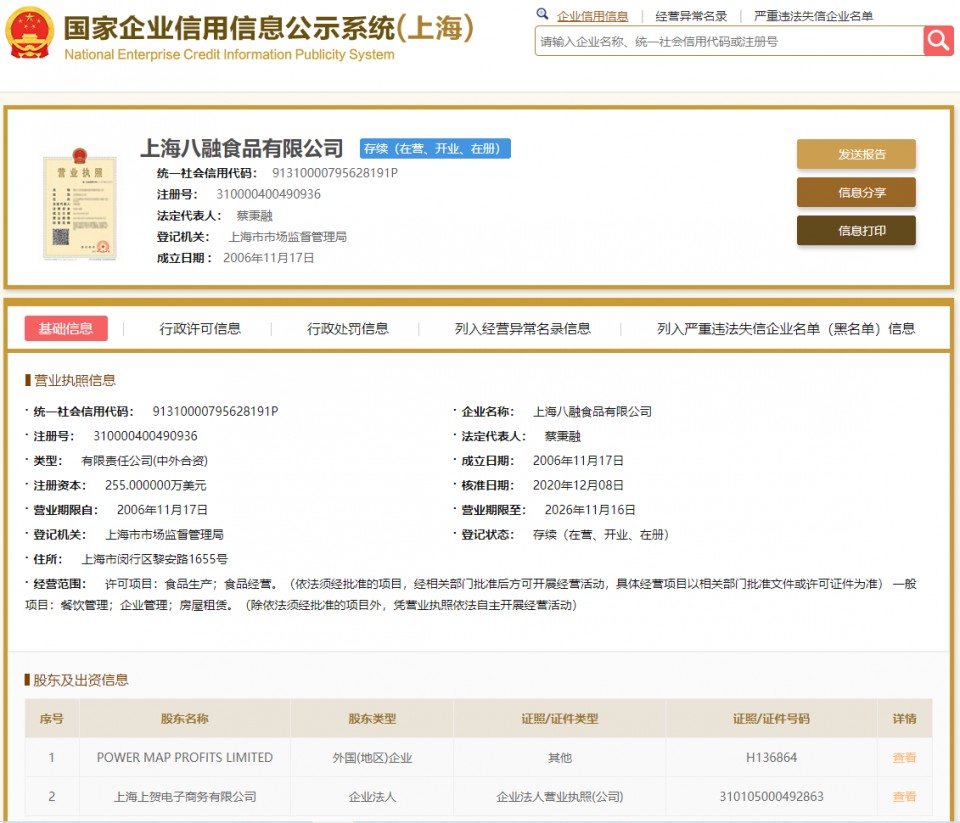 最近的一条行政处罚信息显示:2019年11月29日,对生产经营不符合法律法规或食品安全标准的食品的上海八融食品有限公司,闵行区市场监管局作出行政处罚决定,没收违法所得并罚款1万元。(2019年1月23日,执法人员对当事人当天生产的部分种类、批次的食品进行了抽检,发现冷加工的圆满小蛋糕菌落总数超标。)