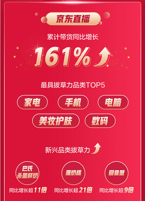 值得一提的是,京东直播更是带火一众新品类,巴氏杀菌鲜奶、猫奶糕、回音壁分别同比增长超11倍、21倍和9倍,掀起新品类热卖狂潮。