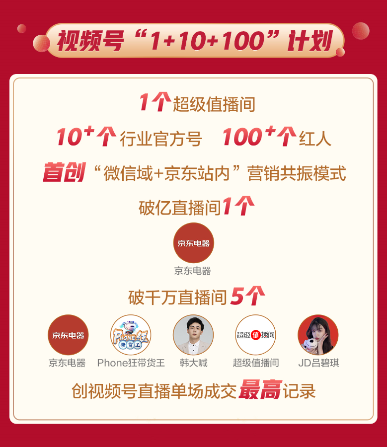 今年的618京东直播重点布局“1+10+100计划”,即1个“超级值播间”+10余个品类官方账号+100余个明星红人。其中官方直播号“京东电器”成功破亿,而吕碧琪和韩大喊成为带货能力最强的两个播主,单场成交量便超2000万。