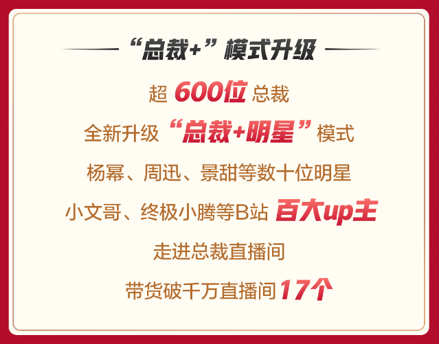 “专业人带专业货”才能让用户有信赖感,安全感,才能最大化的输出品牌价值。京东直播本次就邀请的600余位总裁和众多行业垂类达人亲自分享产品理念和行业知识。专业不代表刻板,京东直播总裁+明星的模式更是将专业和有趣结合,碰撞出不一样的内容火花,诞生出多个爆款直播场次。