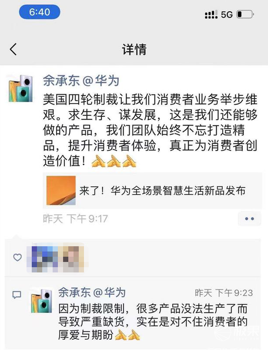 5月份的时候,华为消费者业务总裁余承东在朋友圈向广大支持华为的消费者道歉:“因为制裁限制,很多产品没法生产了而导致严重缺货,实在是对不住消费者的厚爱与期盼。”