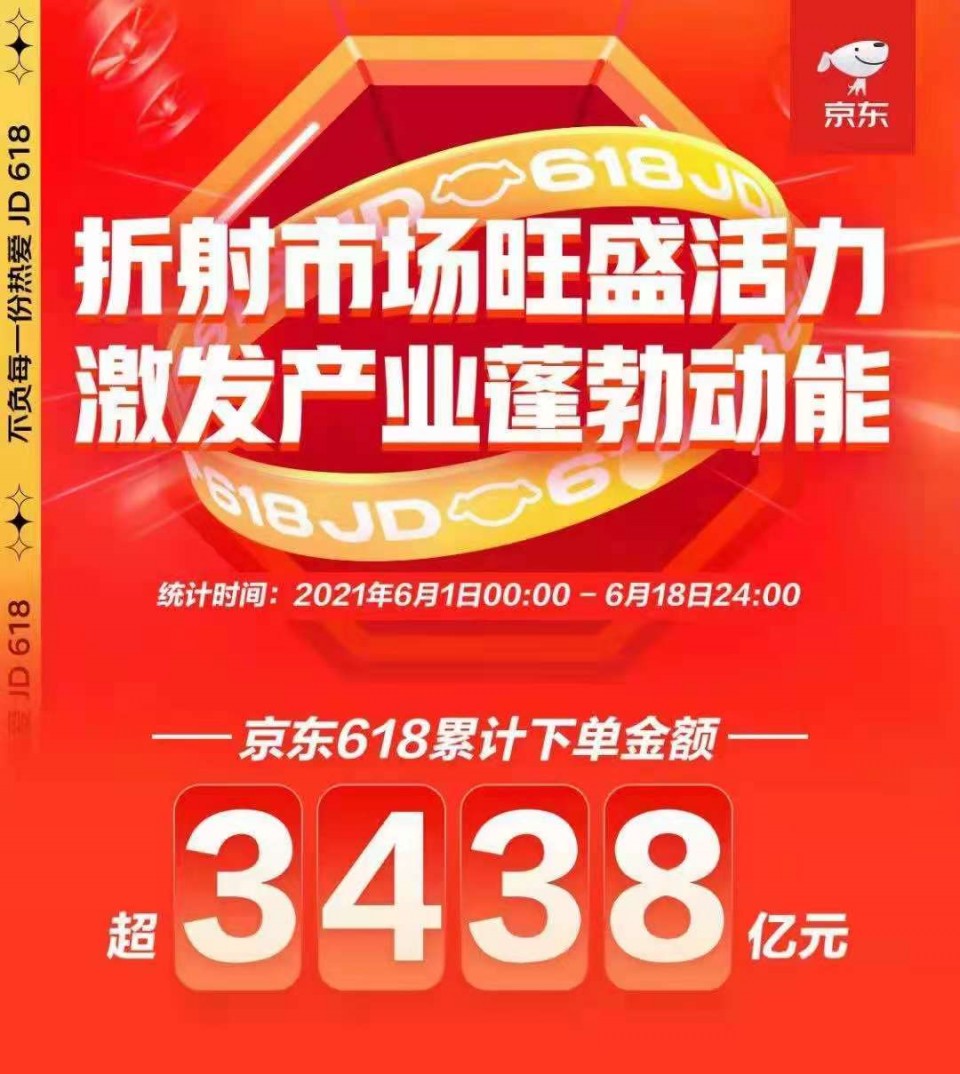 2021年6月1日0时至6月18日24时,2021“京东618,18周年庆”累计下单金额超3438亿元,创下新的纪录!