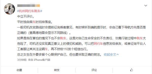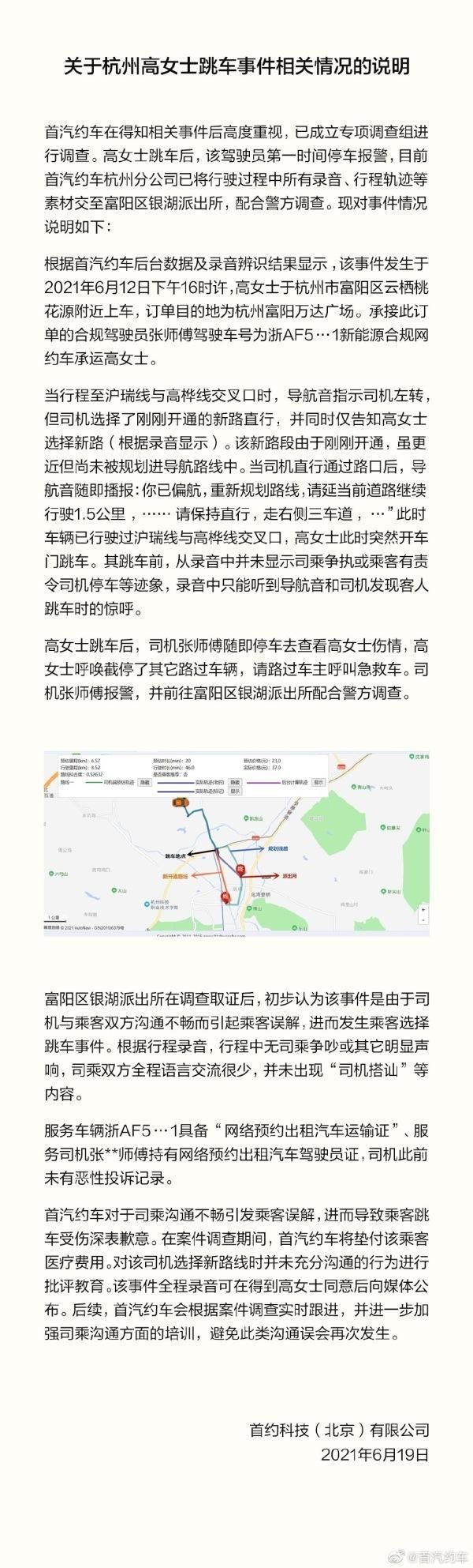 此前,首汽约车官方微博19日晚间发布《关于杭州高女士跳车事件相关情况的说明》称,首汽约车对于司乘沟通不畅引发乘客误解,进而导致乘客跳车受伤深表歉意。