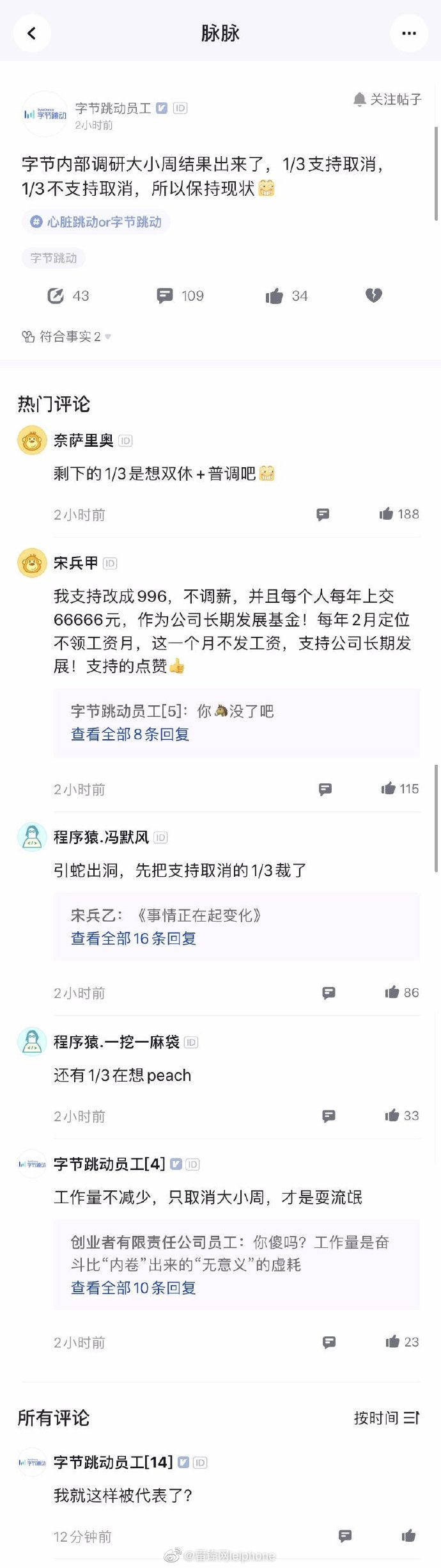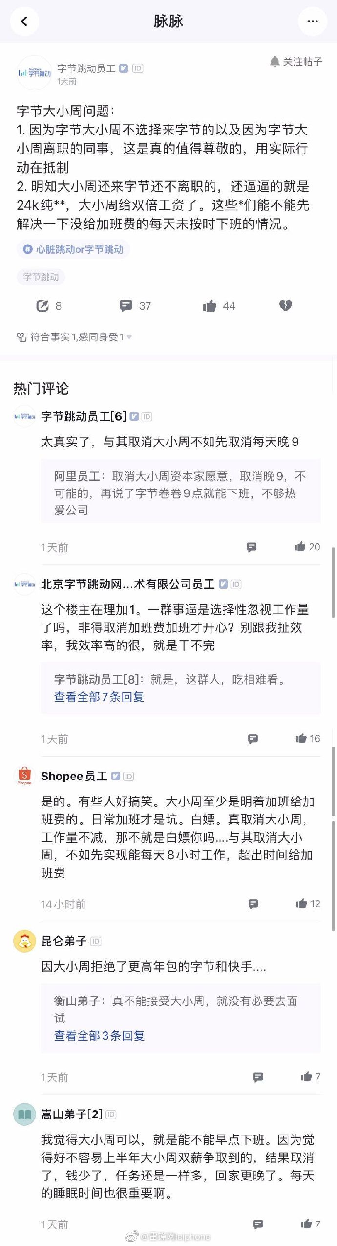 有字节跳动员工透露,取消大小周一直是字节员工最关心的事情之一,“之前每个月脉脉上都会有帖子讨论,每次公司openday也有人提,但一直没有执行”。