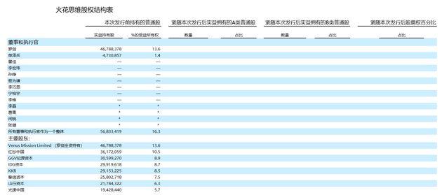 招股书显示,IPO前,火花思维创始人、董事长兼CEO罗剑为公司最大股东,持有46,788,378股普通股,占比13.6%。红杉资本中国为第二大股东,持股比例为10.5%。纪源资本为第三大股东,持股8.9%。