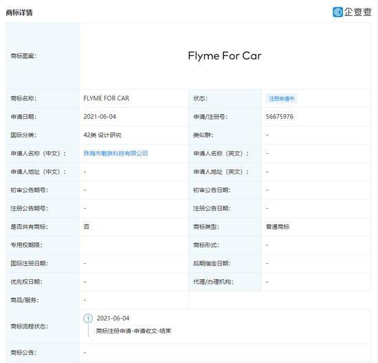 企查查显示,珠海市魅族科技有限公司于6月4日申请注册FLYME FOR CAR商标,国际分类涉42类设计研究等。目前商标状态均为注册申请中,据悉,FLYME FOR CAR为魅族车载系统。