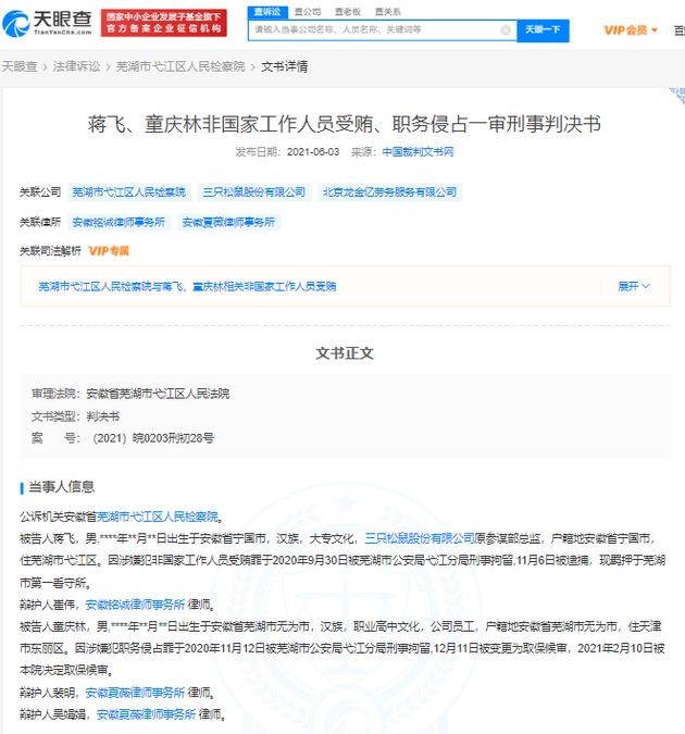 天眼查App显示,近日,蒋某、童某非国家工作人员受贿、职务侵占一审刑事判决书公开,案号(2021)皖0203刑初28号,审理法院为安徽省芜湖市弋江区人民法院。