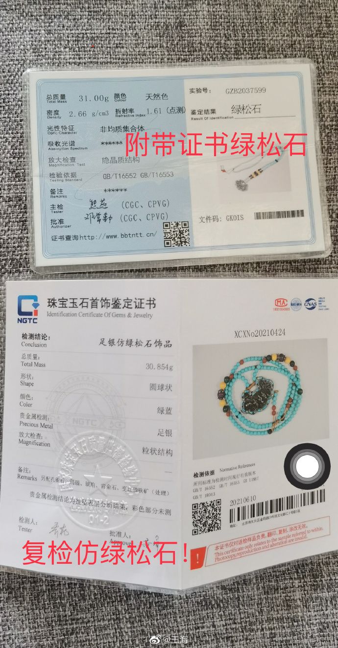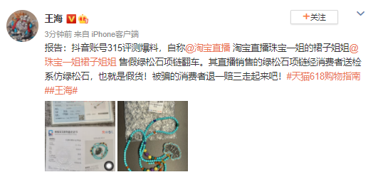 商业 王海爆料淘宝珠宝一姐售假绿松石:送检系假货 2021-06-23 10:58:11 分享 来源:新浪财经以下为微博原文:报告:抖音账号315评测爆料,自称@淘宝直播 淘宝直播珠宝一姐的裙子姐姐@珠宝一姐裙子姐姐 售假绿松石项链翻车。其直播销售的绿松石项链经消费者送检系仿绿松石,也就是假货!被骗的消费者退一赔三走起来吧!