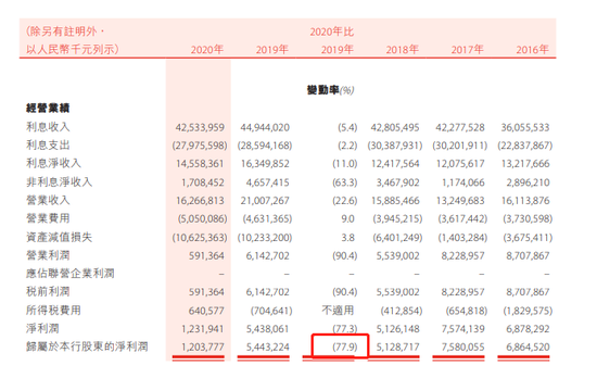 截止2020年12月31日,盛京银行营业收入162.67亿元,较2019年同比下降22.6%;净利润为12.31亿元,同比下滑77.3%;而归属于上市公司净利润为12.04亿元,同比下滑了77.9%。