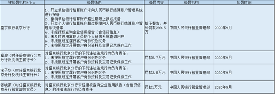 同时,时任盛京银行北京分行反洗钱主管行长章波、时任盛京银行北京分行反洗钱主管行长宋子华和时任盛京银行北京分行营业部综合员张晓蒙,分别罚款5.7万元、3.5万元、1万元。
