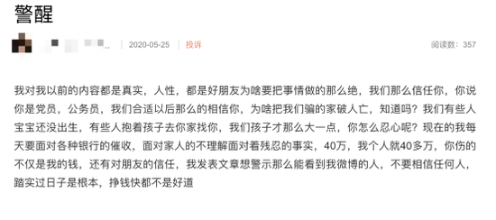 该受害者还表示,自己为了吕某口中的“投资理财”负债累累、水深火热,并且“每天要面对各种银行的催收”。最后,这位受害者提醒大家:“挣钱快都不是好道”。