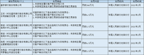 早在今年2月,盛京银行就曾因未按规定履行客户身份识别义务及未按规定报送大额交易报告或者可疑交易报告,被央行沈阳分行罚款246万元。同时,时任盛京银行合规部副总经理王姣及时任运营管理部总经理阮杨均被罚4.5万元;时任信用卡中心总经理邢进和时任零售业务部总经理孙英品均被罚款3.5万元。