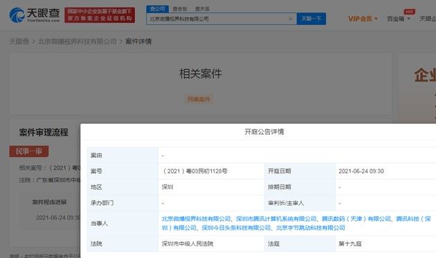炣燃科技6月24日讯(安迪)24日上午消息,天眼查App显示,北京微播视界科技有限公司与深圳市腾讯计算机系统有限公司相关案件于6月24日(今日)正式开庭,案由为不正当竞争纠纷,案号为(2021)粤03民初1128号,审理法院为广东省深圳市中级人民法院,承办部门为知识产权审判庭。开庭公告详情显示,案件当事人为北京微播视界科技有限公司、深圳市腾讯计算机系统有限公司、腾讯数码(天津)有限公司、腾讯科技(深圳)有限公司、深圳今日头条科技有限公司、北京字节跳动科技有限公司。