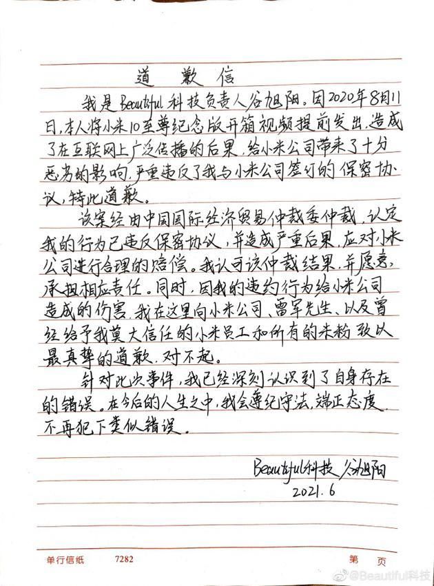 据道歉信显示,2020年8月11日,谷旭阳将小米10至尊纪念版开箱视频提前发出,造成在互联网上造成了广泛传播的后果,给小米公司带来了十分恶劣的影响,严重违反了其与小米公司签订的保密协议。