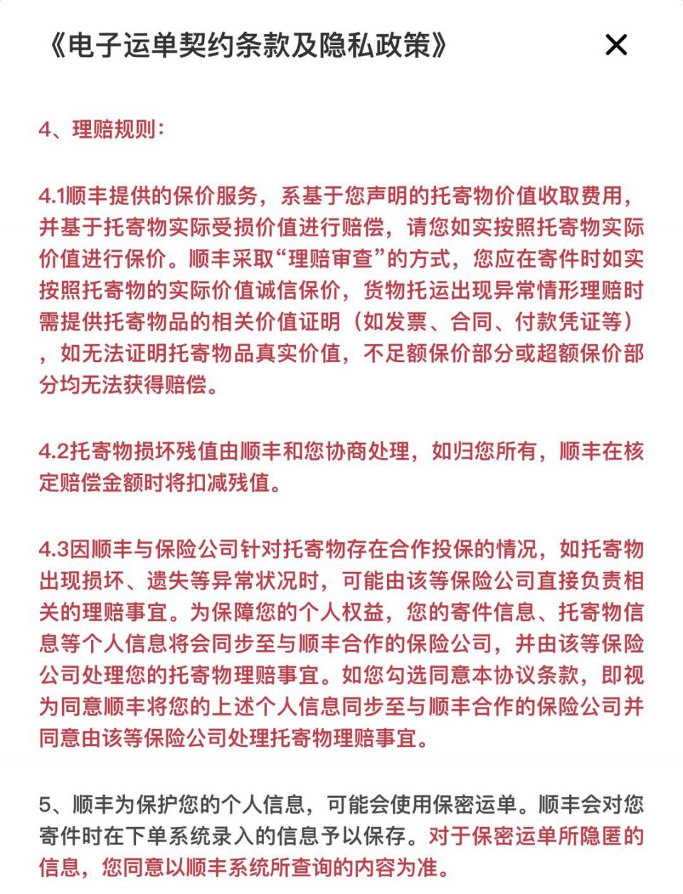在下单之前,消费者需勾选《电子运单契约条款及隐私政策》的理赔规则。
