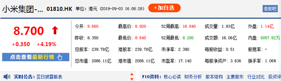 截至9月2日收盘,小米股价仍停留在8.35港元低位,相对于17港元的发行价,跌去过半。不过,受到回购消息的影响,9月3日开盘,小米集团股价开始持续走高,截至收盘时,小米集团报8.7港元/股,当日涨幅4.19%,总市值2090亿港元。