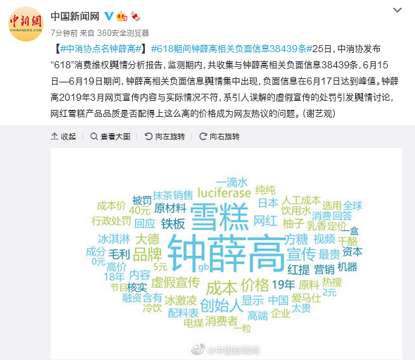 商业 618负面信息近4万条!中消协点名钟薛高 2021-06-25 10:58:26 分享 来源:中国新闻网#618期间钟薛高相关负面信息38439条#25日,中消协发布“618”消费维权舆情分析报告,监测期内,共收集与钟薛高相关负面信息38439条,6月15日—6月19日期间,钟薛高相关负面信息舆情集中出现,负面信息在6月17日达到峰值。钟薛高2019年3月网页宣传内容与实际情况不符,系引人误解的虚假宣传的处罚引发舆情讨论,网红雪糕产品品质是否配得上这么高的价格成为网友热议的问题。(谢艺观)