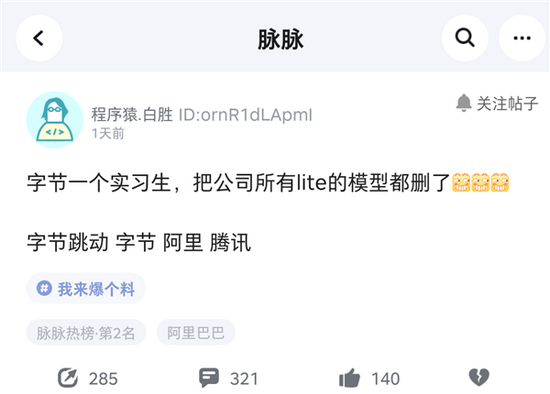 6月24日消息,据脉脉用户爆料,字节跳动一名实习生删除了公司所有lite模型,“直接delete父目录,还加了skip trash”。
