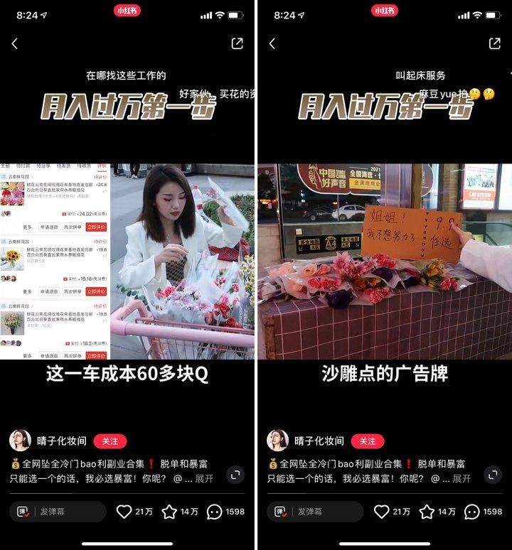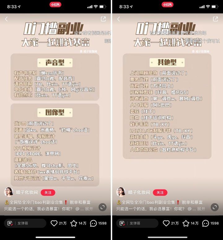 在这样一个平台上,副业也随之通货膨胀了,随随便便就能赚几千元。当然,对比小红书月入百万的帖子,这些副业内容已经很朴素了。0 成本、冷门暴利、不踩雷、适合小白……只是在这些吸引人的关键词背后,小红书博主推荐的副业可能并不适合你。