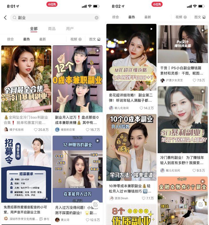 ▲ 小红书有很多副业内容,关键词大多是 0 成本、暴利、适合小白