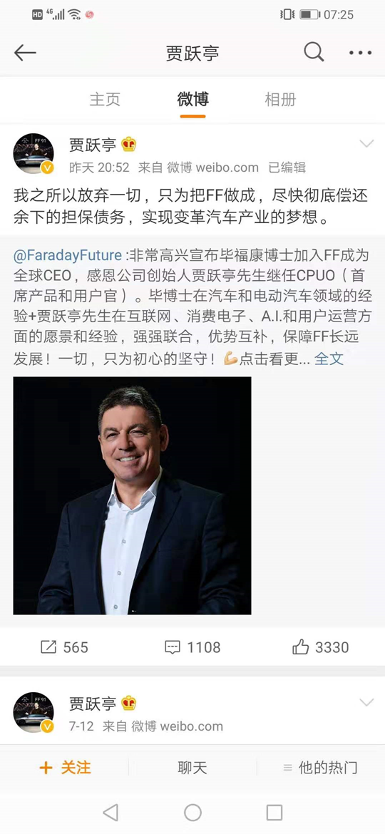原创内容 FF宣布贾跃亭辞去CEO职务 2019-09-04 08:16:51 分享 炣燃科技9月4日讯 近日,法拉第未来(FF)官方宣布,公司创始人贾跃亭将辞去CEO职务,改任CPUO(首席产品和用户官),其接任者为毕福康博士(Dr. Carsten Breitfeld)。随后,贾跃亭在其个人微博上发文表示:之所以放弃一切,只为把FF做成,尽快彻底偿还余下的担保债务,实现变革汽车产业的梦想。”据了解,贾跃亭转任公司CPUO后,将负责互联网生态系统战略的整体落实,领导人工智能、产品定义、用户获取、用户体验和用户运营等相关工作。