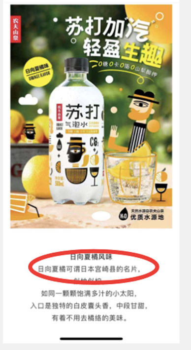 事实上,在农夫山泉4月1日推出的的气泡水中,另一款“日向夏橘”口味也采用了类似的品宣手法,暗指“日向夏橘”产自日本宫崎县。