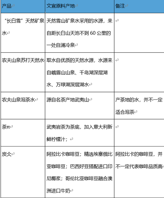 据新浪财经不完全统计,近年来农夫山泉旗下的多款产品,都在原料产地上,做了特别的宣传。