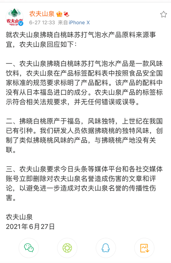 昨日,农夫山泉发官方微博回复称:“该产品的配料中没有从日本福岛进口的成分……拂晓白桃原产于福岛,我们研发人员依据拂晓桃的独特风味,创制了类似拂晓桃风味的产品,与拂晓桃产地没有关联。”