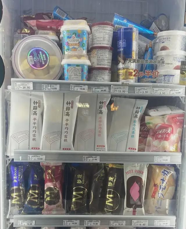《IT时报》记者观察到,即使在上海市中心外,例如嘉定、闵行等地区的全家、罗森便利店内,高价网红雪糕仍占据着主要位置。综合来看,钟薛高一款牛乳雪糕和一款可可雪糕的价格在这些便利店中分别为13元和18元。而中型超市的价格约降至12元和16元。