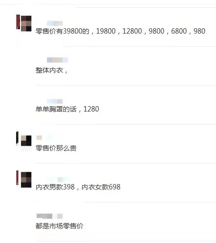 “整体内衣的零售价有39800元的,也有19800元、12800元、9800元、6800元、980元。如果是单购买胸罩,1280元,女士内衣698元,男士内衣398元”,对方介绍,这些价格都是由他们进行代加工的客户品牌市场零售价。
