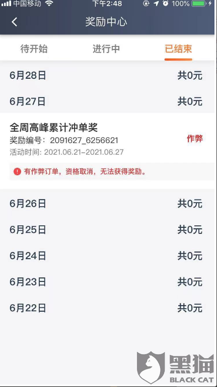 6月29日消息,黑猫投诉显示,在滴滴平台于2021年6月21日至6月27日推出高峰单奖励后,一位投诉用户称,为了挣这笔奖励每天工作16小时左右,直到27日晚0点完成奖励(还超出了奖励范围)。