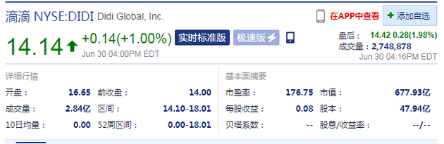 北京时间7月1日凌晨消息,滴滴今日正式登陆纽交所,股票代码为“DIDI”,发行价为14美元/ADS。滴滴开盘价为18美元,较发行价上涨28.5%,截止收盘,滴滴股价上涨1%,报14.14美元,按照收盘价计算,滴滴市值近678亿美元。