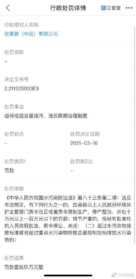 商业 欧莱雅因排污超标被罚19万 2021-07-01 09:39:58 分享 来源:中新经纬企查查APP显示,欧莱雅(中国)有限公司因超标或超总量排污、违反限期治理制度,被罚19万元,处罚单位为浦东新区城市管理行政执法局。此前,欧莱雅公司还曾因发布虚假广告、发票违法等被处以行政处罚。据其官网显示,欧莱雅旗下产品包括彩妆、美发、护肤等。