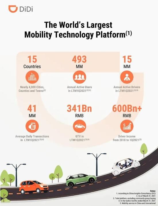 从单量和交易额来看,在截至2021年3月31日的12个月里,滴滴全球平均日交易量为4100万单,全平台总交易额为3410亿元人民币。2018年1月1日至2021年3月31日的3年时间内,平台司机总收入约6000亿元人民币。