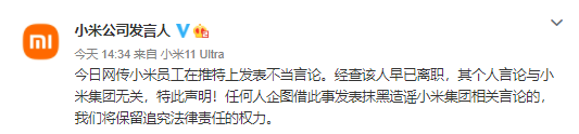 今日网传小米员工在推特上发表不当言论。经查该人早已离职,其个人言论与小米集团无关,特此声明!任何人企图借此事发表抹黑造谣小米集团相关言论的,我们将保留追究法律责任的权力。
