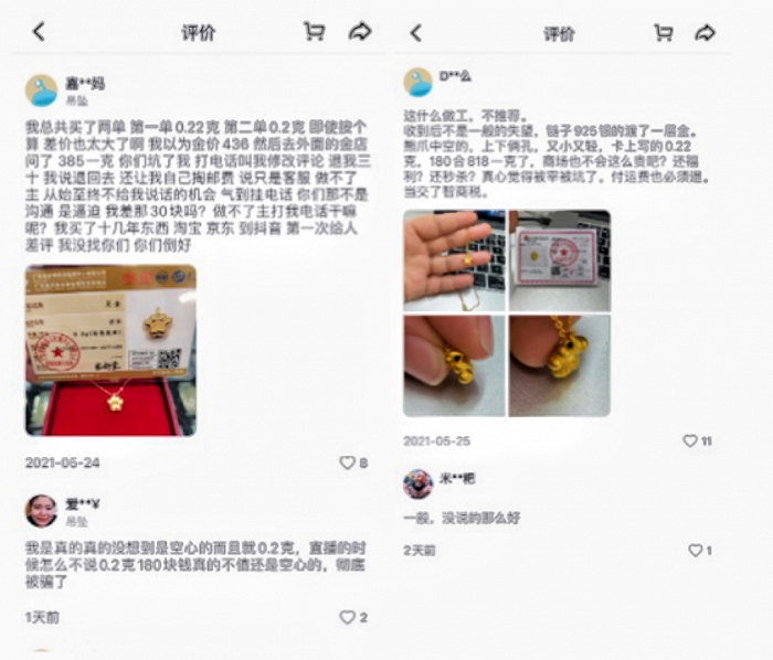 但也有一些收到货的“家人”们称“被割了韭菜”:直播间镜头里看起来很大的黄金吊坠实际不足一克,很闪的钻戒原来是成本极低的莫桑钻。