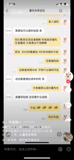 同样被诱导消费的网友李闻,在董先生直播间抢到了一款福利价200多元的经典六爪钻戒,到手之后才发现是“一文不值”的莫桑钻。她发布的截图显示,面对她“为什么收到的是人造钻,这算什么福利”的质问,董先生珠宝直播间的客服称,“莫桑钻也可以叫钻戒,主播已经是接近成本价的售卖。直播只说是钻戒,没说是什么钻。”