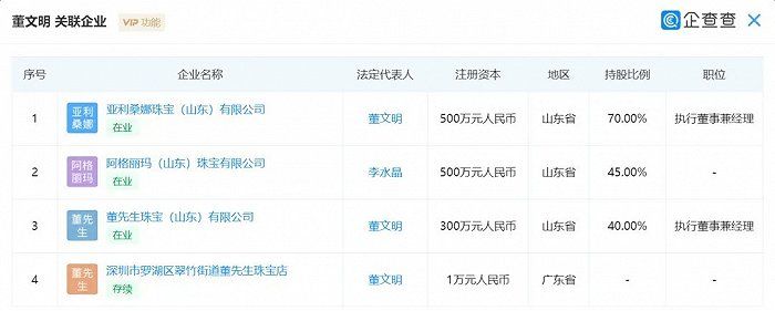 有自媒体曾称,董先生最开始从事的是珠宝鉴定仪器的销售工作,曾在淘宝和快手做过电商生意,之后入驻抖音,开始带货。据企查查显示,董先生真名为董文明,目前旗下有三家公司和一家珠宝店,分别位于山东和广东。