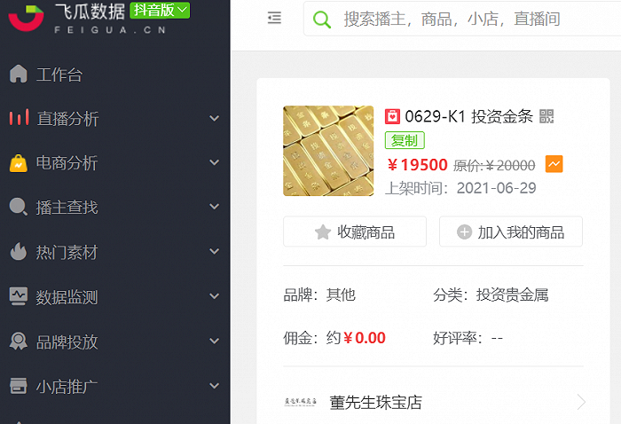 董先生珠宝直播间19500元的投资金条 图源 / 飞瓜数据