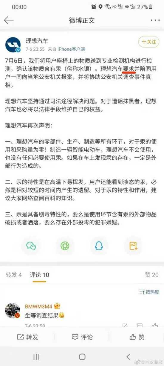 7月4日晚,有理想车主在“理想汽车”App的社区发布视频并配文称“理想汽车座椅里面往外渗水银”。理想汽车回应称,专业检测机构进行检测确认该物质含有汞(俗称水银)。理想汽车要求并陪同用户一同向当地公安机关报案,并将协助公安机关调查事件真相。