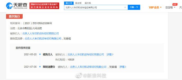 商业 人人车被限制高消费:未按时履行给付义务 2021-07-08 10:56:15 分享 来源:新浪科技天眼查App显示,近日,北京人人车旧机动车经纪有限公司因未按时履行给付义务,被限制高消费,关联对象为刘春福,案号为(2021)京0105执23266号。根据限制消费令显示,关联案件涉及该公司单位合同、无因管理、不当得利一案,因该公司未按执行通知书指定的期间履行生效法律文书确定的给付义务,被限制高消费。