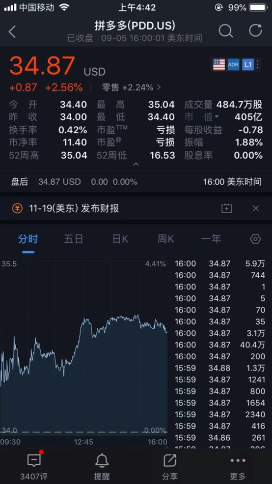 截至收盘,拼多多股价涨2.6%,报34.87美元,今年累计涨55.39%,市值为405亿美元。与此同时,百度股价周四收涨1.5%,报104.12美元,市值为363亿美元。