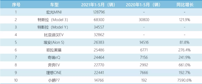 在新能源车1-5月销量排行前十的车型中,小鹏P7仅位居第10。