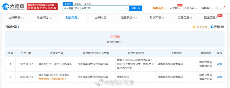 科创 统一饮料开盖中奖率造假被罚6万:之前曾因类似事由被罚5万 2021-07-09 15:29:54 分享 来源:新浪科技天眼查App显示,近日,统一商贸(昆山)有限公司因违法有奖销售行为及其从属被罚款60000元(用手机微信扫描鲜橙多瓶盖内的二维码获得应援值与实际不符,抽奖无法计算出相应的中奖概率)。股东信息显示,该公司由统一企业(中国)投资有限公司全资持股。值得一提的是,此前,该公司也曾因类似事由被罚款5万。