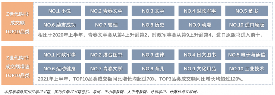 京东图书数据显示,2021年上半年,Z世代购书用户数量同比增幅高于全年龄段购书用户数量同比增幅,也是上半年购书用户增速最快的群体。