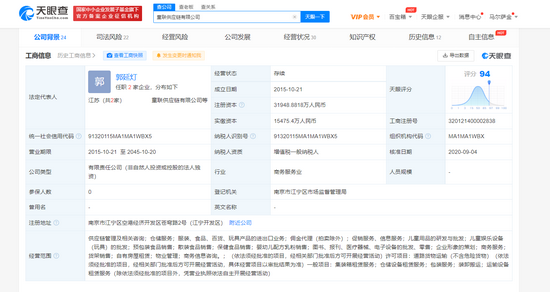 商业 孩子王关联公司被强制执行450万 2021-07-12 10:46:26 分享 来源:新浪财经天眼查App显示,近日,童联供应链有限公司新增被执行人信息,执行标的4500000元,案号(2021)苏0191执1982号,执行法院为江宁经济技术开发区人民法院。关联案件为浙江天元建设(集团)股份有限公司相关案件。童联供应链有限公司成立于2015年10月,注册资本约3.19亿人民币,法定代表人为郭延灯。股权穿透图显示,该公司由孩子王儿童用品股份有限公司全资持股。